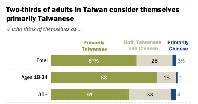 Según una reciente encuesta del Pew Research Center, un 67% de la población de Taiwan se siente principalmente taiwanesa, frente a sólo el 3% que se siente principalmente china, y un 28% que se siente tanto taiwanesa como china. El sentimiento identitario taiwanés es todavía más fuerte entre los jóvenes.