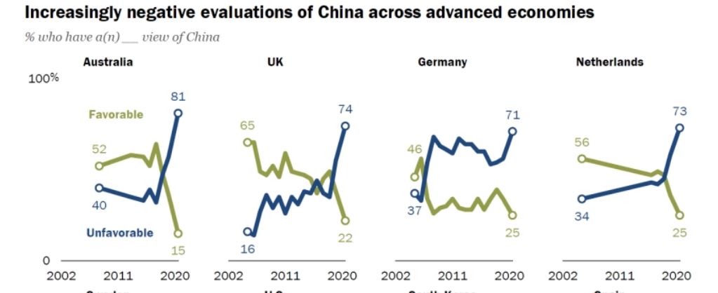 La percepción de China se vuelve cada vez más negativa en los países desarrollados, según un estudio del Pew Research Center. Un 71 y un 74% de la población de Alemania y Reino Unido, respectivamente, manifiestan una opinión desfavorable de China (63% en España). En la actualidad, una amplia mayoría de la población tiene una visión negativa de China en los 14 países estudiados. Crece también con fuerza el porcentaje de la población que declara no tener confianza en el presidente Xi Jinping (que en España es del 75%).